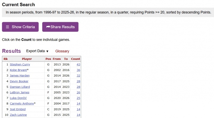 這是東契奇職業(yè)生涯第26次單節(jié)20+,追平詹姆斯,并列歷史第6!