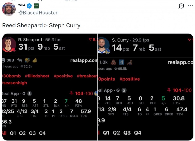 賽后火箭媒體人@BiasedHouston曬出謝潑德和庫里本場(chǎng)數(shù)據(jù),寫道:“謝潑德>庫里?!?/p>