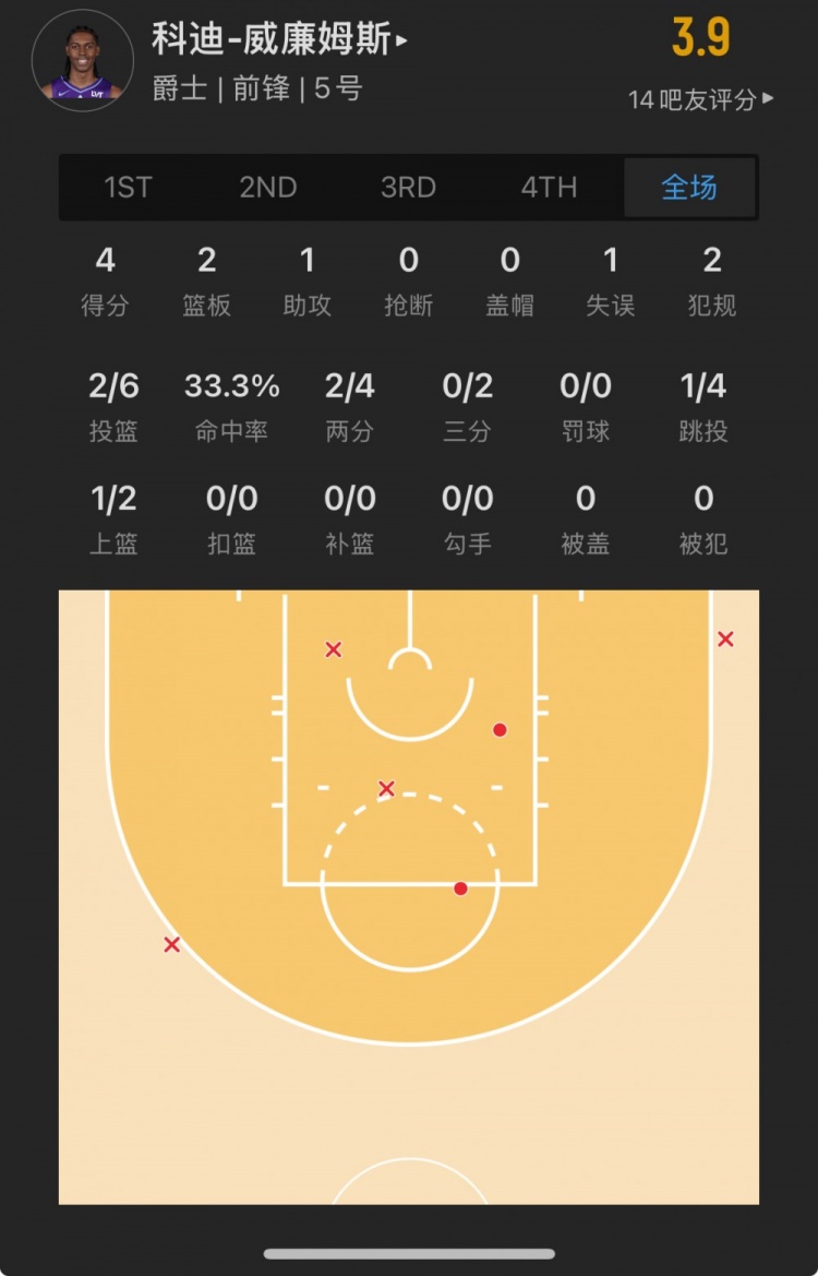 爵士10號秀 科迪-威廉姆斯 登場20.4分鐘