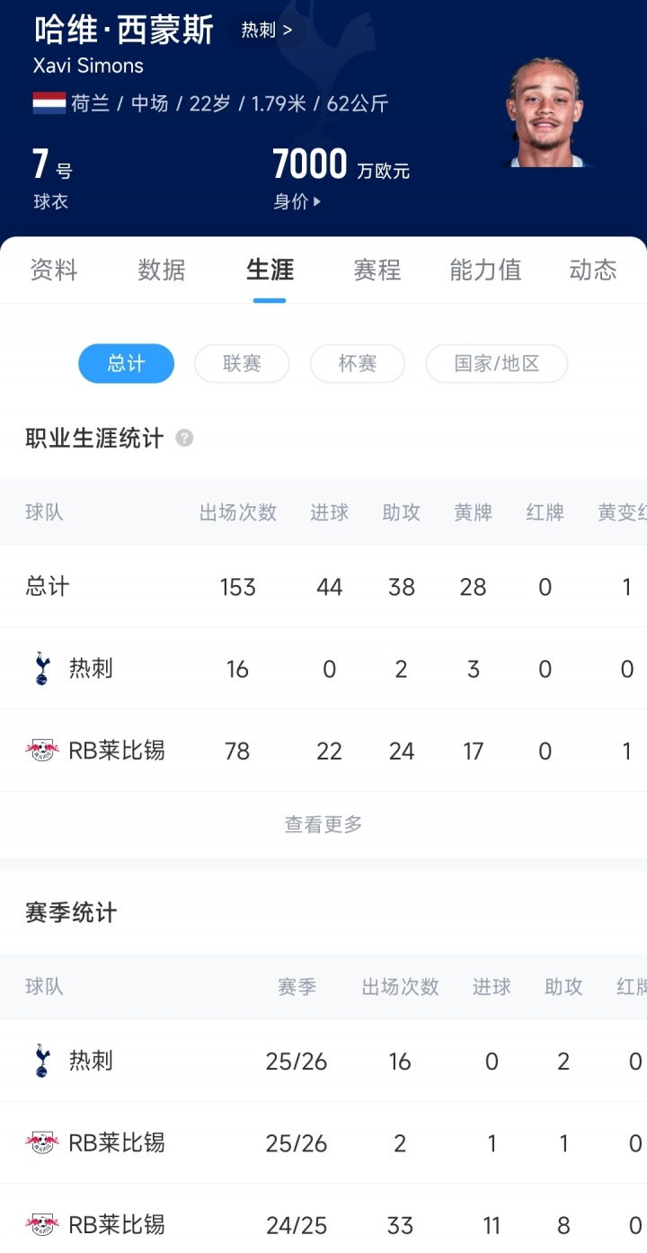 本賽季加盟熱刺后,哈維·西蒙斯已經(jīng)代表球隊出戰(zhàn)了16場比賽,出場時間937分鐘,僅貢獻2次助攻,沒有取得進球,熱刺的戰(zhàn)績相比開季時也急轉(zhuǎn)直下。
