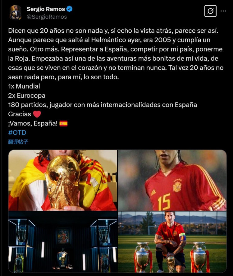 3月27日訊 拉莫斯更新社媒,慶祝他代表西班牙國(guó)家隊(duì)首秀20周年。