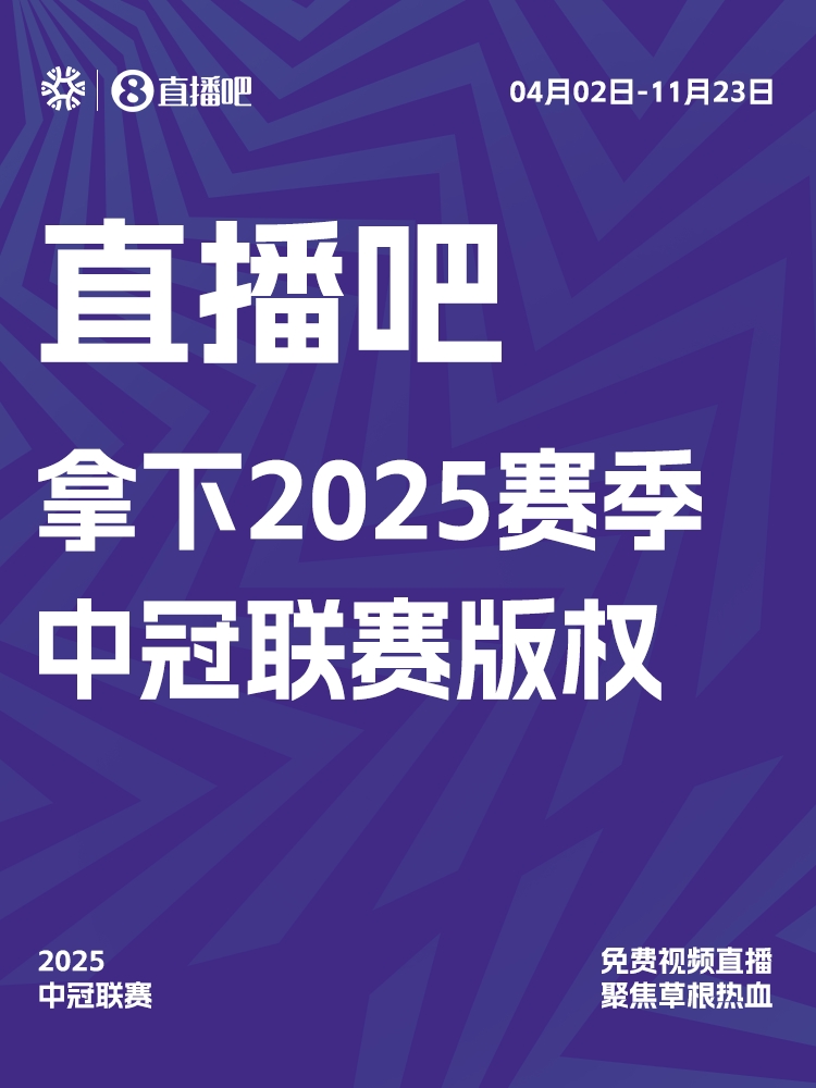 告訴吧友們一個好消息,我們拿到了2025賽季中國足協(xié)杯版權(quán)、2025賽季中國足球甲級聯(lián)賽版權(quán)、2025賽季中國足球乙級聯(lián)賽版權(quán)、2025賽季中冠聯(lián)賽版權(quán)。2025賽季,將全程免費視頻直播足協(xié)杯、中甲、中乙、中冠四項賽事。上,高清比賽免費看,與億萬吧友同頻共振!