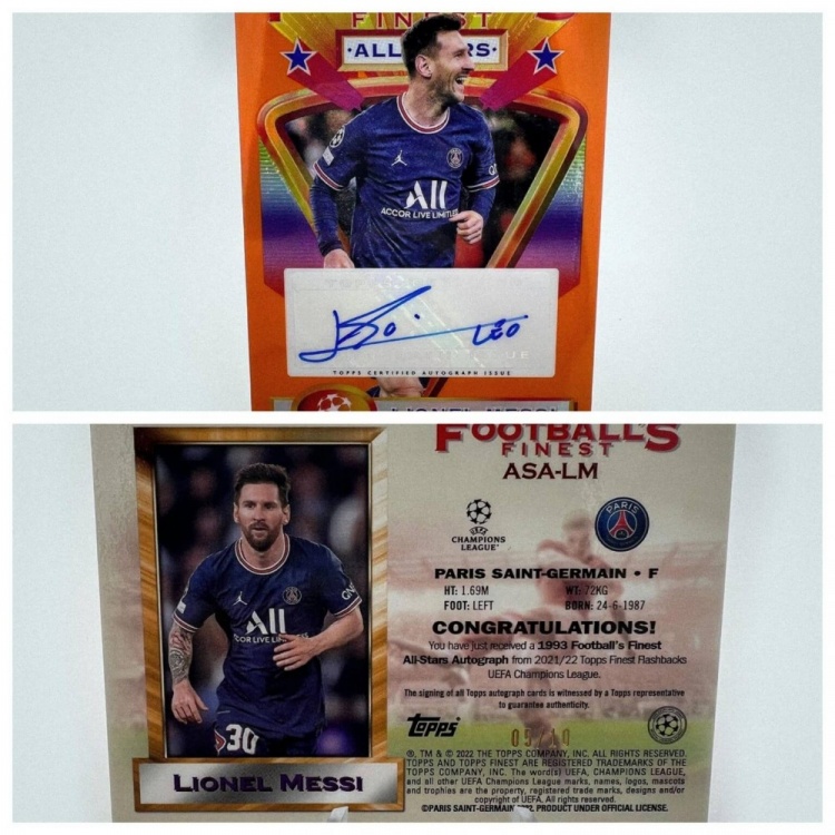 這張2021-22賽季Topps Finest Flashbacks UEFA Champions League Football’s Finest全明星簽名橙折射卡,全球僅印制10張。正面小字標(biāo)注著“Topps認(rèn)證簽名版本”??ㄆ趁孢€提供了更多保證:“所有Topps簽名卡的簽署過程均有Topps代表現(xiàn)場監(jiān)督,確保真實性?!边@張卡片潛在價值超過1000美元。